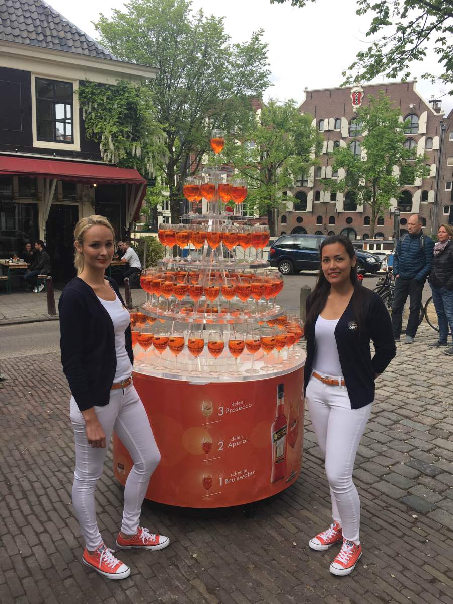 Normaliter vullen we de champagnetoren met prosecco of champgne, maar het is natuurlijk ook mogelijk om de champagnetoren te voorzien van uw producten. Dit hebben wij bijvoorbeeld al gedaan voor: Mona Pudding, Campari, Heineken, Moët &Chandon, Samsung, Aperol Spritz etc. etc..
